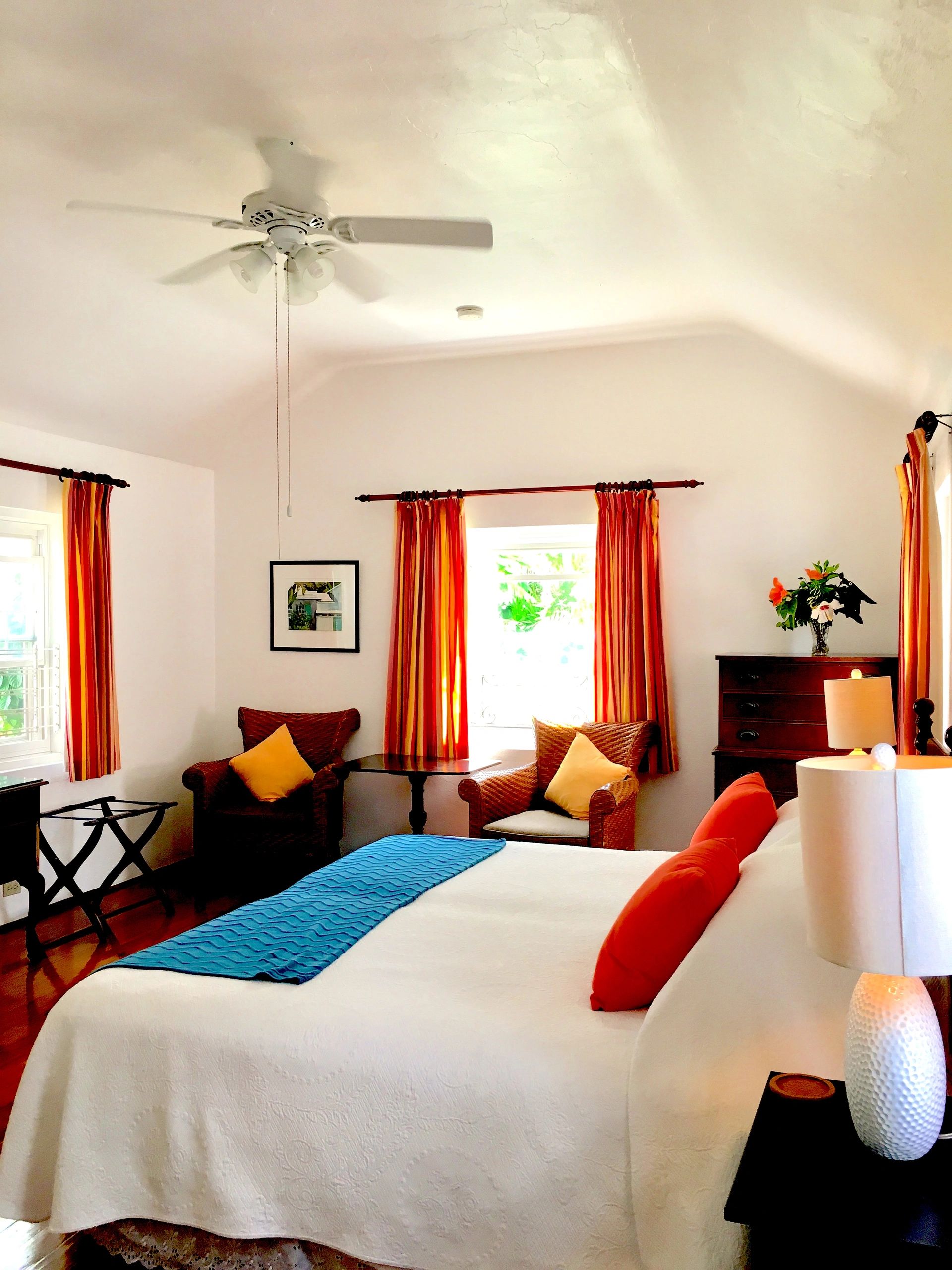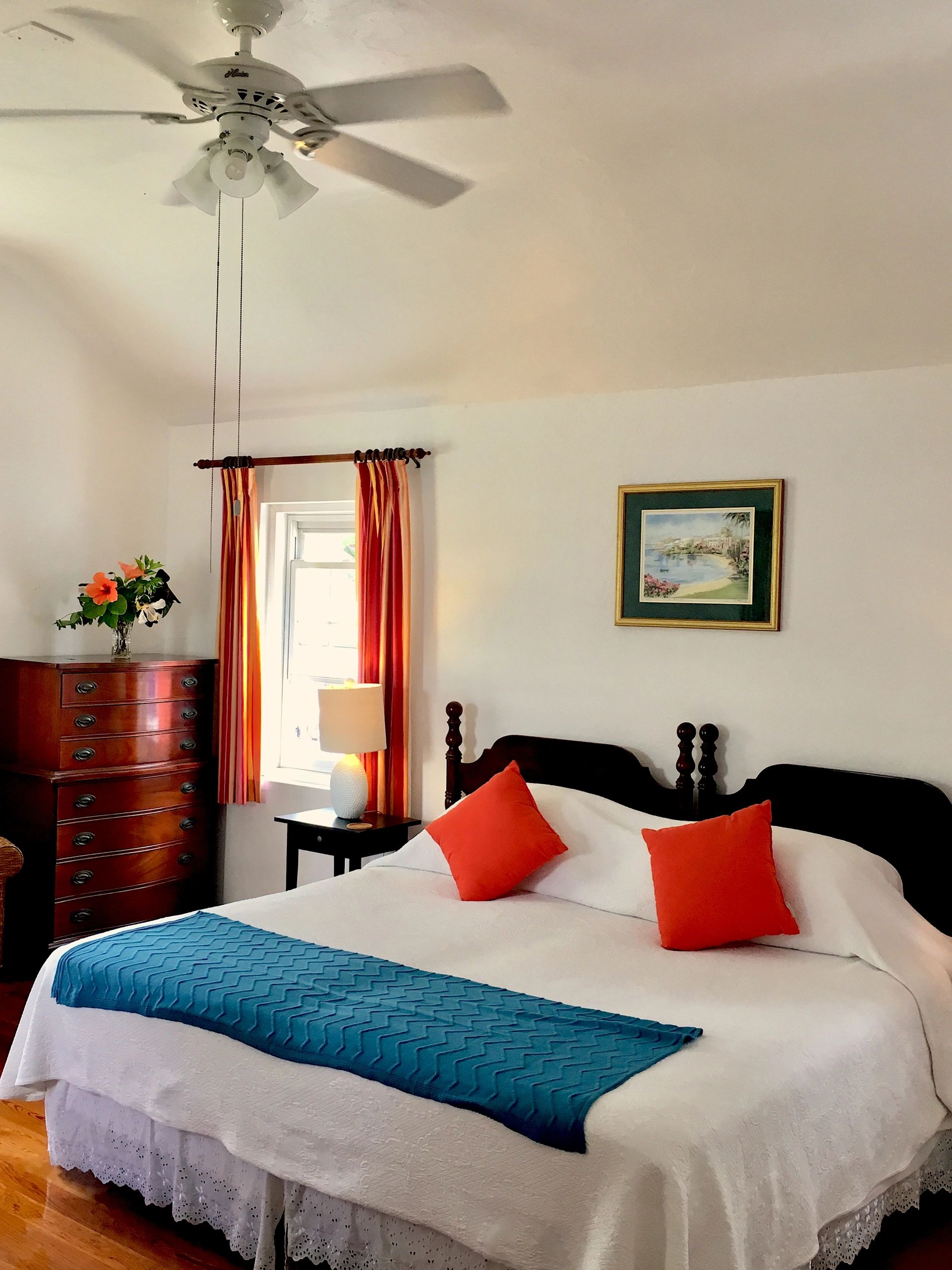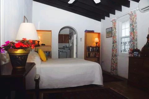 This attractive "Solo" room is in the main house. It is bright and cheery & has a queen size bed. It is ideal for single occupancy. It has varnished wood floors, a closet, & a chest of drawers. It has a private bathroom with walk-in shower. There is air-conditioning as well as a ceiling fan. Guests have the use of a fully equipped kitchen where they can cook meals & refrigerate perishables.